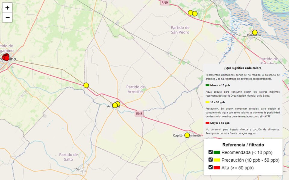 Este valor nos ubica en la categoría Amarilla del mapa (entre 10 y 50 ppb), que según los especialistas, exige «precaución» y la realización de estudios adicionales para evaluar si el consumo sostenido representa un riesgo para la salud de los vecinos. En la región norte, otras ciudades como Capitán Sarmiento, San Nicolás y Zárate también fueron mencionadas en zonas de alerta. El caso de Pergamino, en tanto, está ubicado en la categoría Roja del mapa (más de 50 ppb), donde se aconseja “no consumir para ingesta directa y cocción de alimentos” e incluso “Reemplazar por otra fuente de agua segura”.
