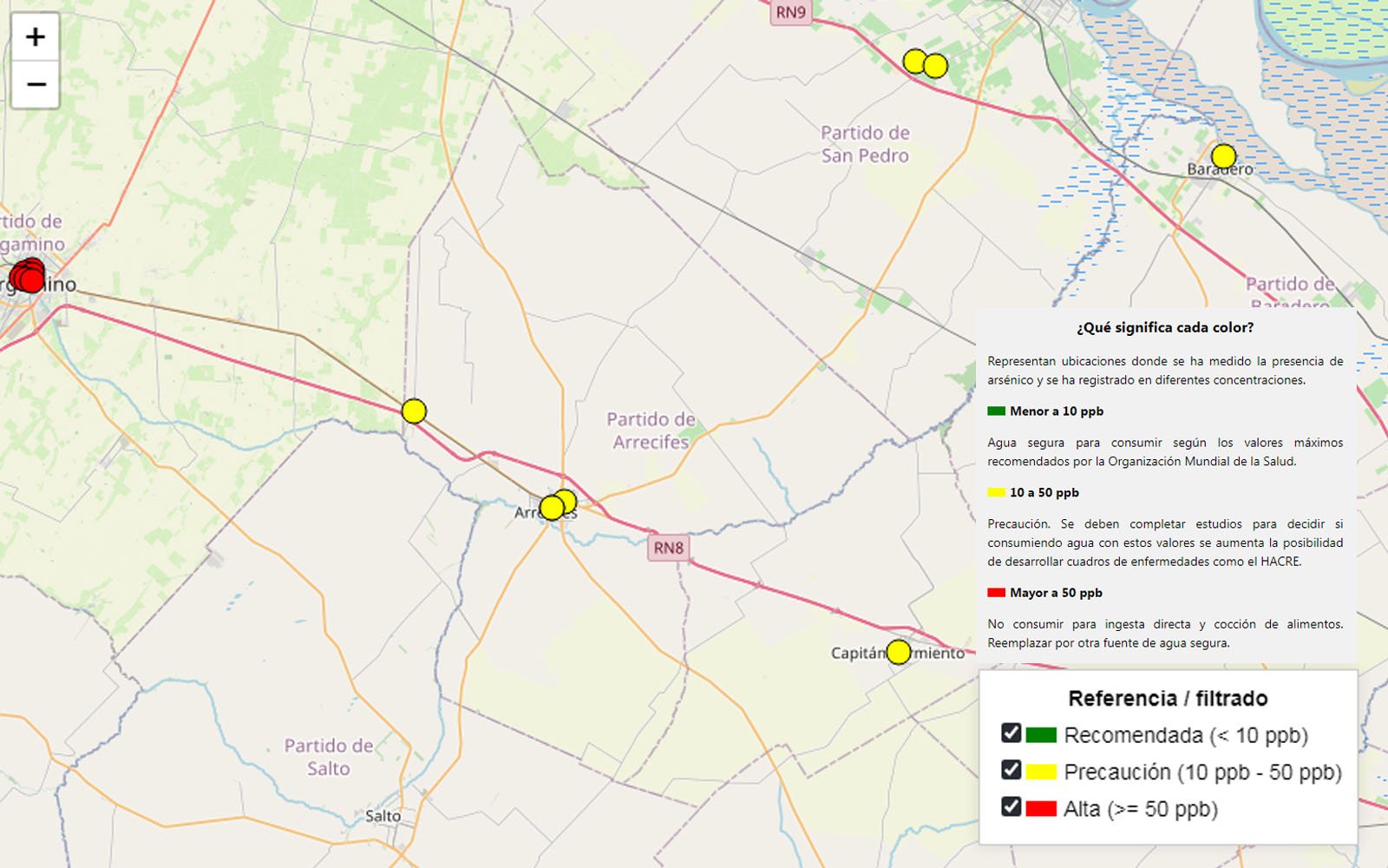 En el caso de Arrecifes. Las muestras fueron tomadas en el cruce de Ruta 8 y Malvinas Argentinas (23.33 ppb), inmediaciones de la Escuela 2 (16.1 ppb), Viña (26 ppb); el agua de red, en tanto, arrojó 15.7 ppb. En el caso de nuestra ciudad, todas las muestra datan de aproximadamente 10 años de antigüedad.