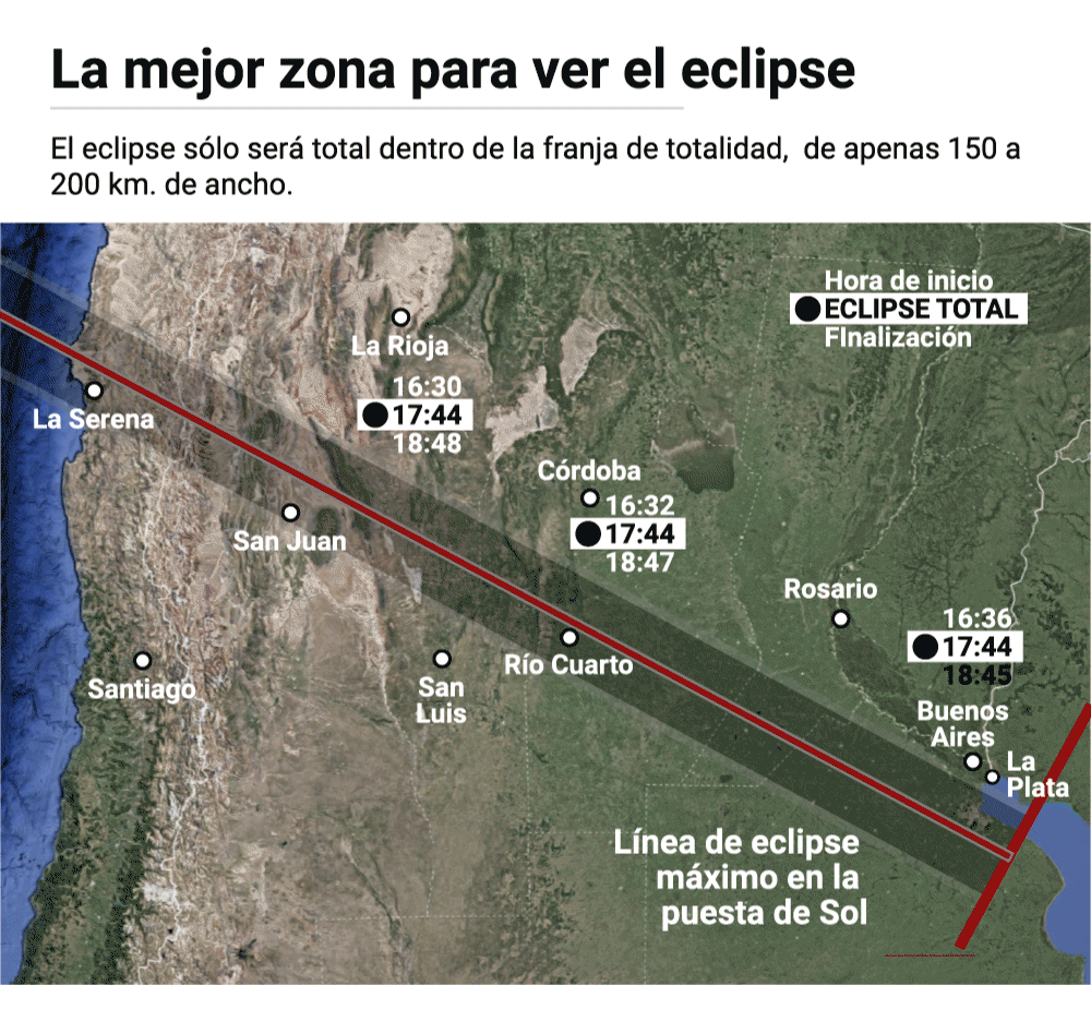 «El eclipse total de Sol 2019 se podrá observar al final del día, alrededor de las 17.40 hs en una banda de 130 km de ancho que atravesará Argentina de oeste a este, hasta unos kilómetros al sur de Buenos Aires, y puede durar hasta dos minutos y medio», precisó Rodrigo Díaz, investigador del CONICET en el Instituto de Astronomía y Física del Espacio en Buenos Aires (IAFE).