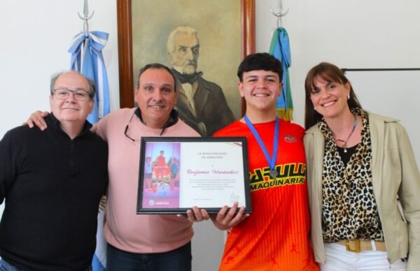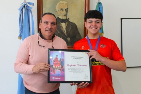 Esta mañana, en el despacho municipal, el intendente Javier Olaeta, acompañado por el director de deportes Cristhian Davini y el profesor Fernando Pérez, recibió a los destacados deportistas Carlos Balbarani y Benjamín Fernández.