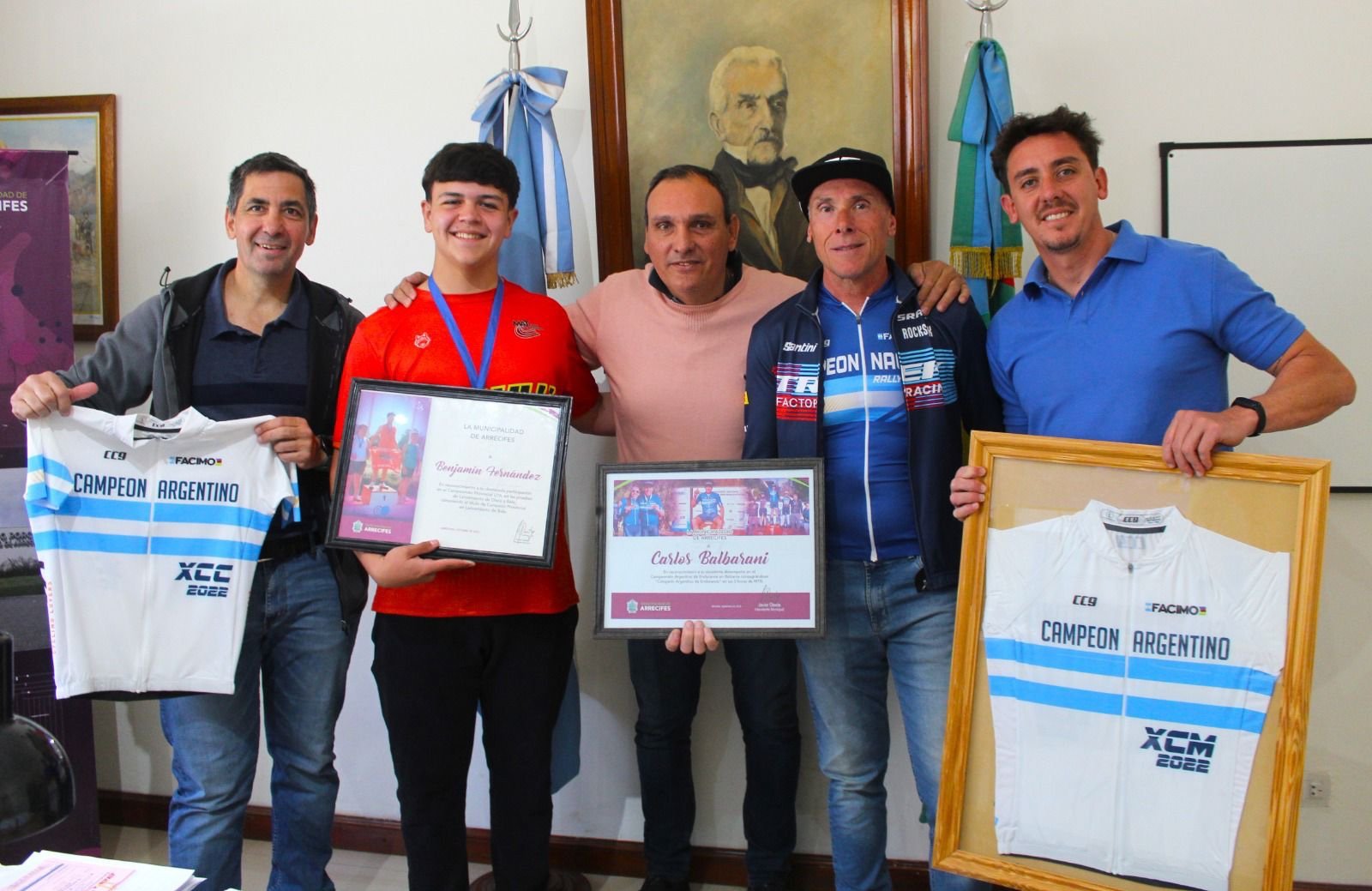 Esta mañana, en el despacho municipal, el intendente Javier Olaeta, acompañado por el director de deportes Cristhian Davini y el profesor Fernando Pérez, recibió a los destacados deportistas Carlos Balbarani y Benjamín Fernández.