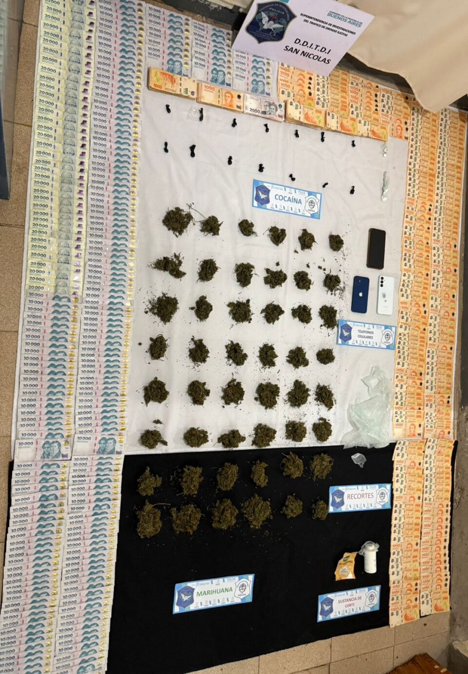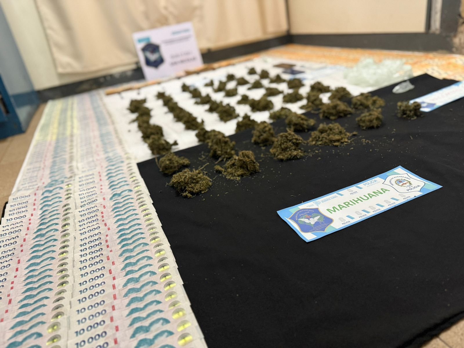 - Bolivia y Honduras: En el lugar, la policía incautó más de $4.300.000 en efectivo, más de medio kilo de flores de marihuana de alta calidad valuadas en más de $5.000.000, dos teléfonos celulares y recortes de nylon que se usan para fraccionar la droga.