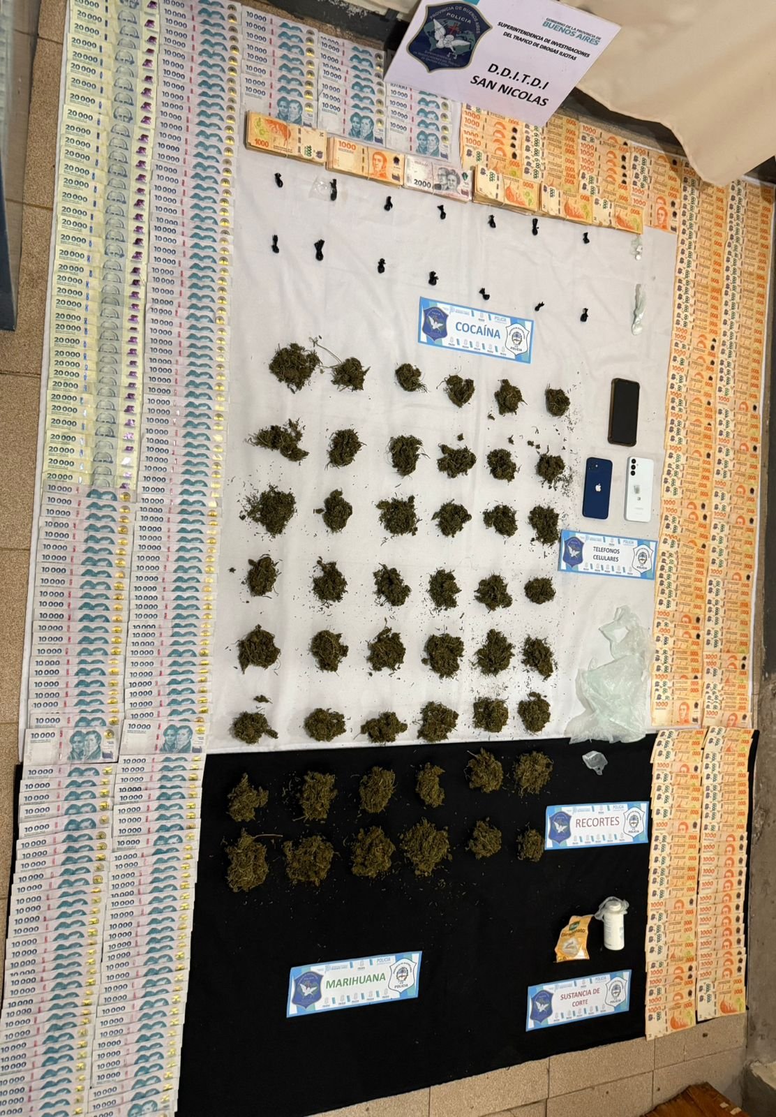- Calle Francia al 50: Se incautaron dosis de cocaína listas para vender, elementos para estirar y dosificar la droga, dinero en efectivo y un teléfono celular.