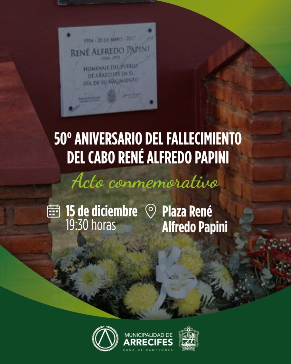 La Municipalidad de Arrecifes invita a la comunidad a participar de un emotivo acto en conmemoración de los 50 años del fallecimiento del Cabo René Alfredo Papini, un héroe de nuestra ciudad.