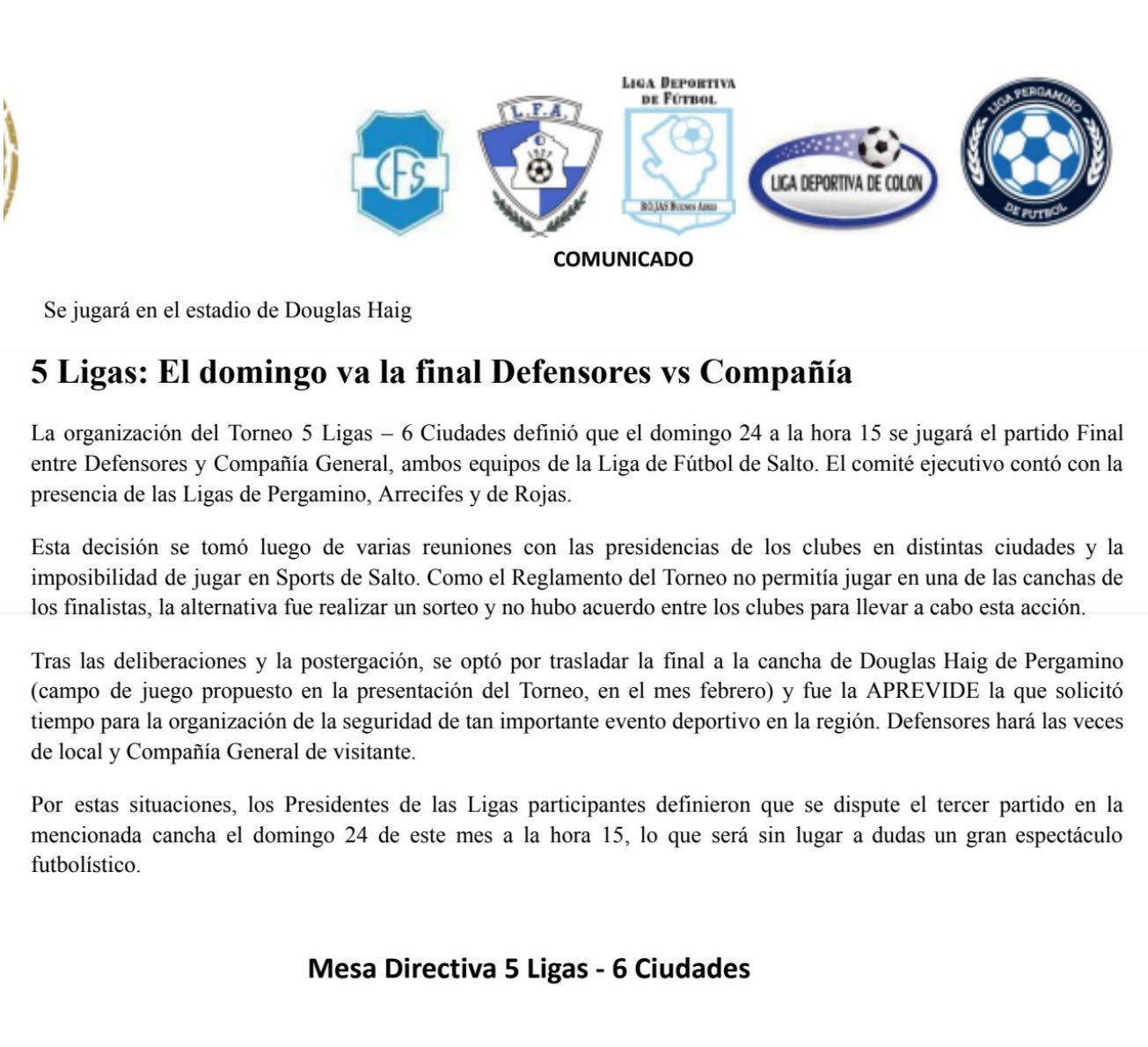 La Mesa Directiva del Torneo 5 Ligas – 6 Ciudades ha confirmado la sede para el encuentro final entre los equipos Defensores y Compañía General, ambos pertenecientes a la Liga de Fútbol de Salto. El partido se jugará en el estadio de Douglas Haig de Pergamino el domingo 24 de agosto a las 15:00 horas.
