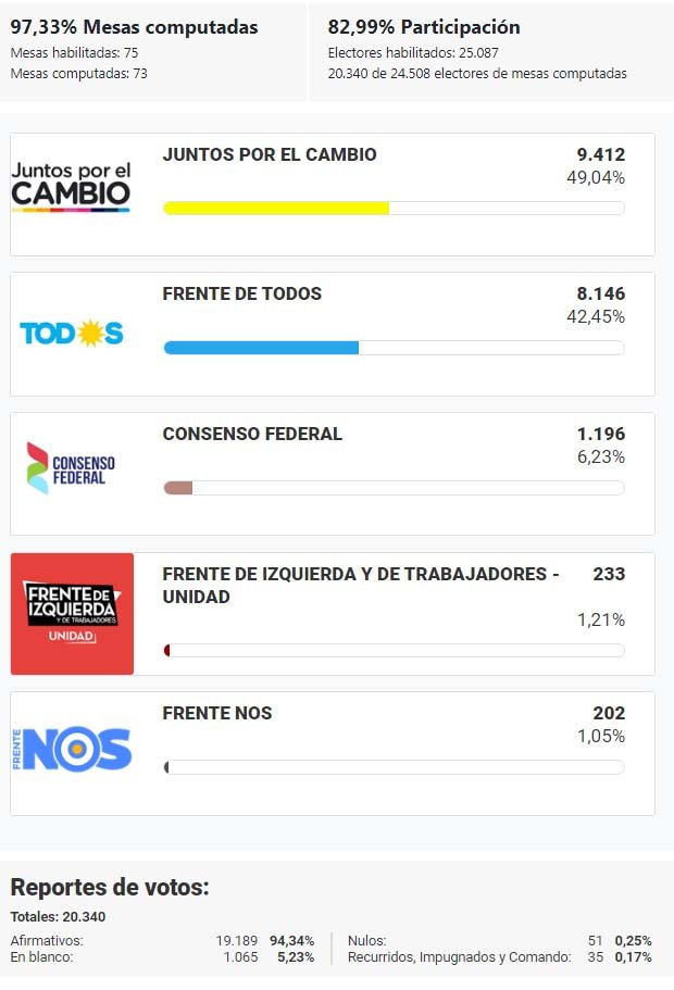 Según los datos oficiales proporcionad por la por la Dirección Nacional Electoral (DINE), La lista de Juntos por el Cambio, que además llevó a la arrecifeña Juliana Picoy como primera suplente, obtuvo 9.412 votos (49,04% de los votos afirmativos); el Frente de Todos llegó en Arrecifes a los 8.146 votos (42,45%). Por otro lado, los candidatos de Consenso Federal, con la arrecifeña Mónica Martino en el 3° lugar, llegó a los 1.196 votos (6,23%), el Frente de Izquierda y de los Trabajadores alcanzó el 1,21% (233 votos) y el Frente Nos sumó 202 votos (1,05%).