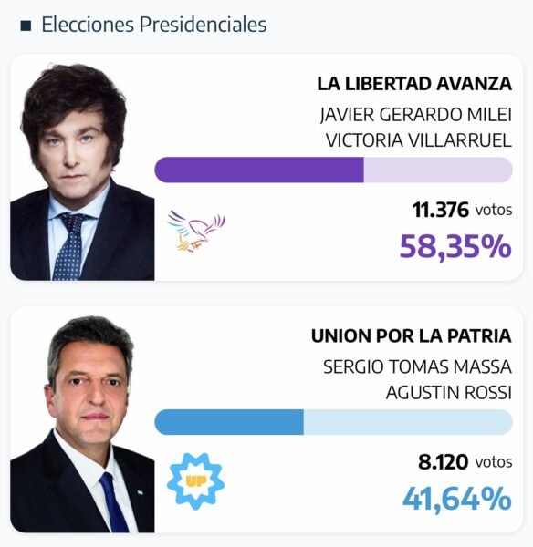 La fórmula Javier Milei – Victoria Villarruel obtuvo 11.376 votos (58,36%), derrotando a la fórmula oficialista: Sergio Massa – Agustin Rossi, que sumó 8.120 votos (41,64%).