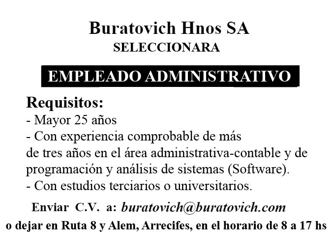 Enviar CV a buratovich@buratovich o dejar en Ruta 8 y Alem, Arrecifes, en el horario de 8 a 17 hs