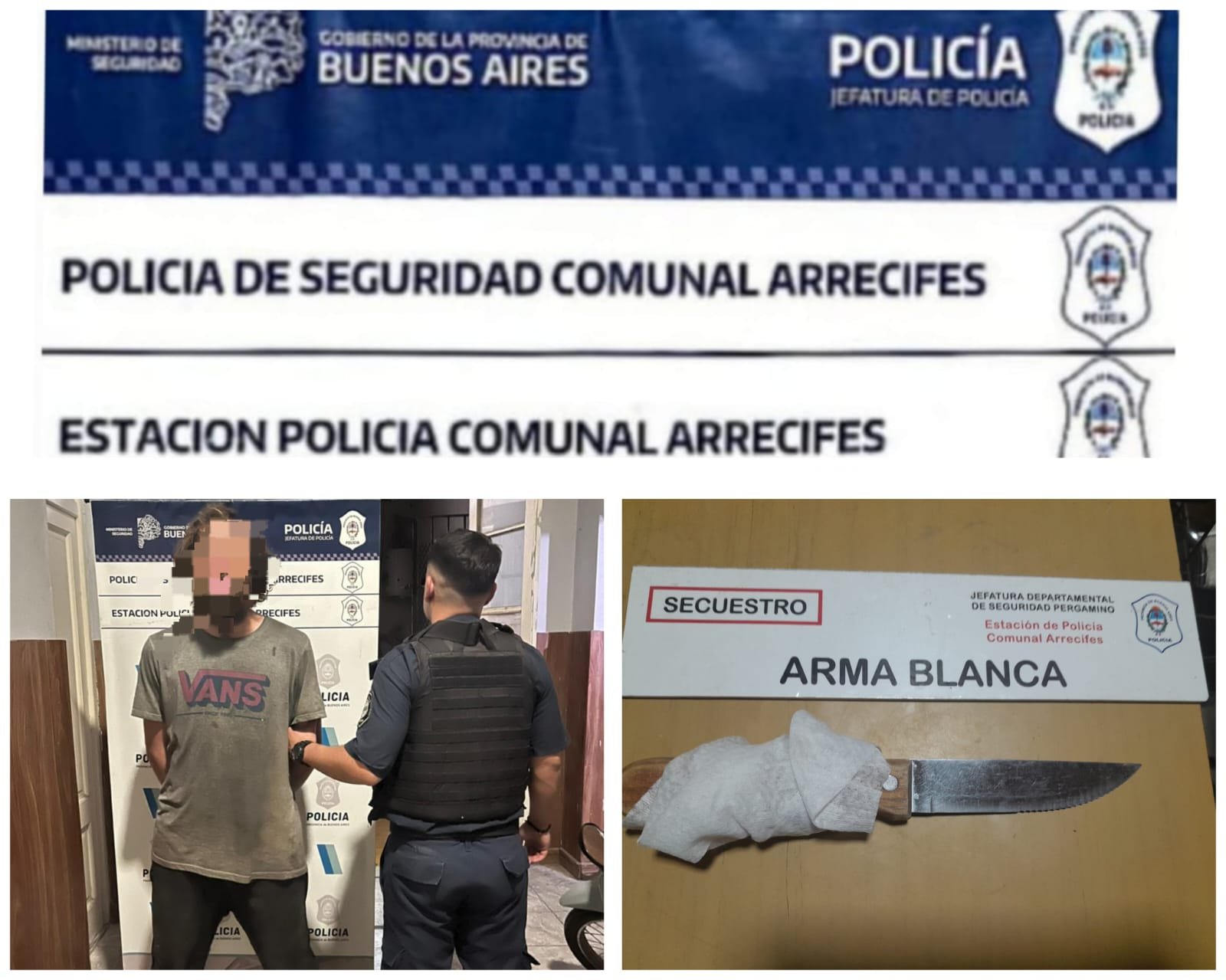 Antes de trasladar al primer agresor, la policía realizó una requisa de seguridad y descubrió que el sujeto llevaba entre sus pertenencias un arma blanca con empuñadura de fabricación casera, la cual fue inmediatamente incautada.