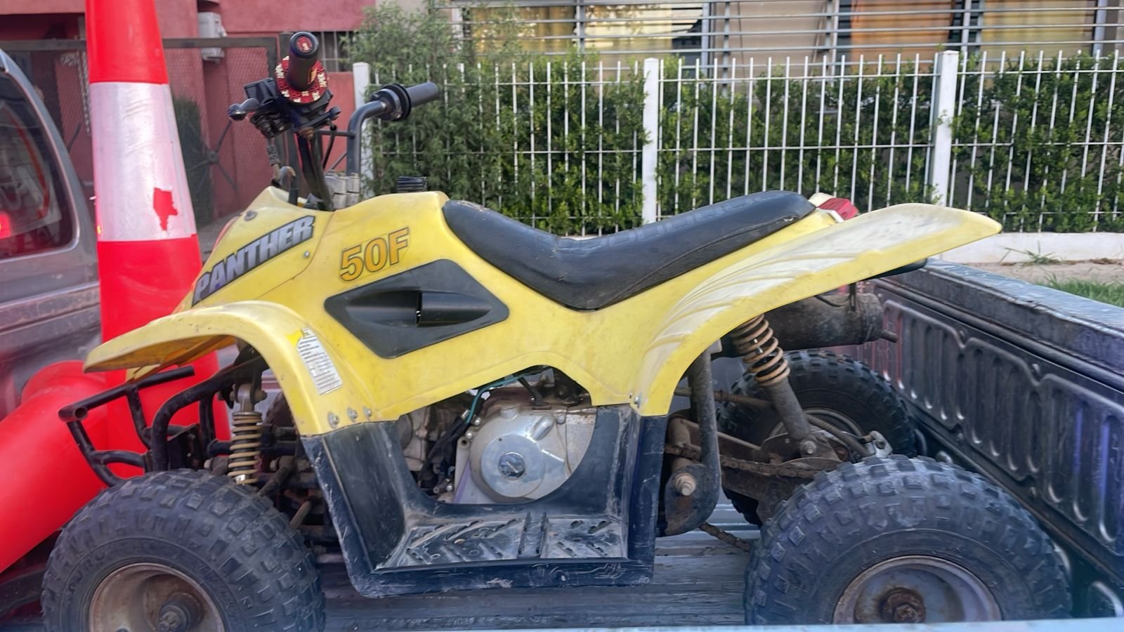 Poco después, otro llamado anónimo movilizó a la Patrulla Urbana hacia la calle Tucumán, en el barrio Fonavi. Allí, los agentes interceptaron un cuatriciclo Panther 50cc de color amarillo.