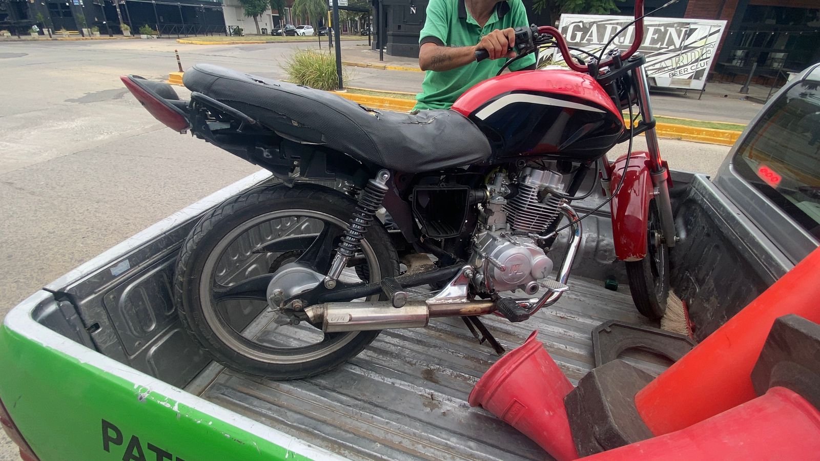 Más tarde, a las 16.45, en la intersección de avenida Belgrano y Merlassino, se retuvo una motocicleta Motomel 125, color roja y negra, conducida por un vecino de Arrecifes. El conductor no contaba con licencia de conducir, seguro obligatorio, cédula de identificación ni casco, y el rodado presentaba escape no reglamentario.